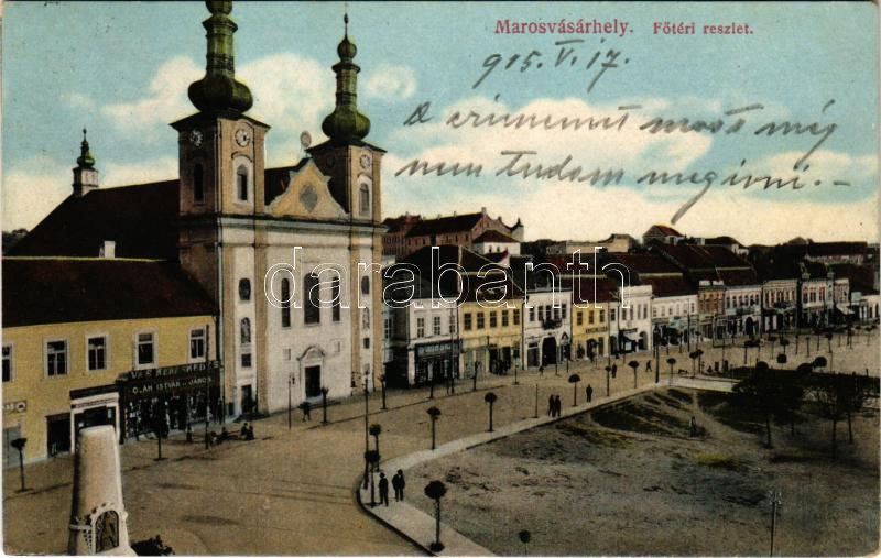 Description: 1915 Marosvásárhely, Targu Mures; Fő tér, templom, Oláh István és János, Lukács János, Lang Béla üzlete. Porjes S. Sándor kiadása / main square, church, shops (EK)