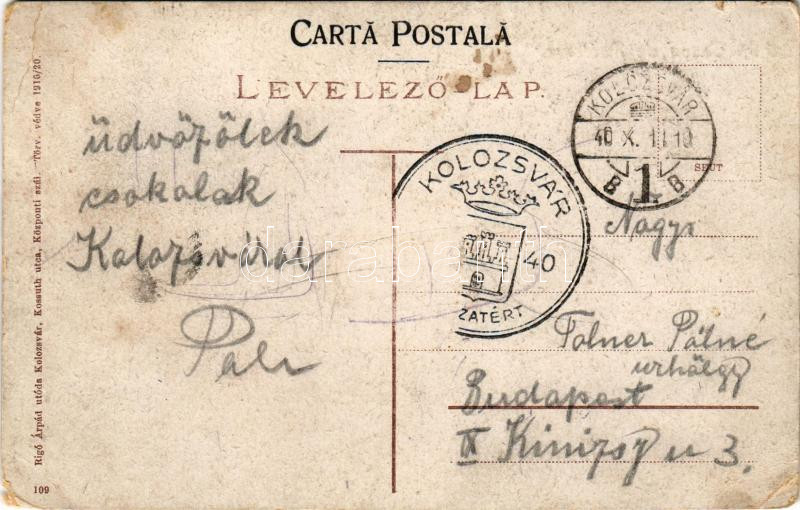 Description: Kolozsvár, Cluj; Kolozsvári Takarékpénztár, Első Magyar Biztosító Társaság a Sebestyén palotával. Rigó Árpád utóda kiadása / Cassa de Pastrare / savings bank, insurance company, palace + "1940 Kolozsvár visszatért" So. Stpl. (EM)