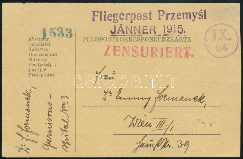 1915 Jó állapotú tábori lap "Fliegerpost Przemysl" Bécsbe