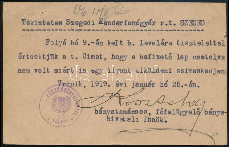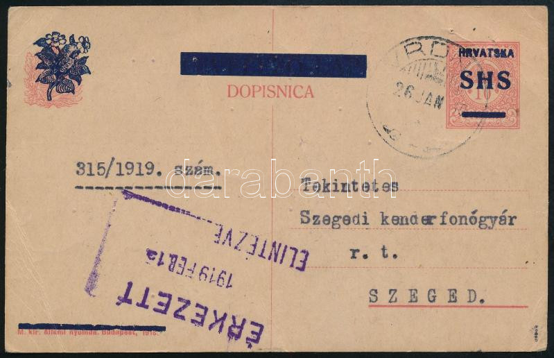 https://www.darabanth.com/en/512-Online-auction/512.0/Selected-Hungarian-items-and-collections/Single-hungarian-issues-at-a-very-low-price~587/1919-SHS-felulnyomasu-dijjegyes-levelezolap-Bodor-vizsgalojellel-VRDNIK-Szeged~II3460322