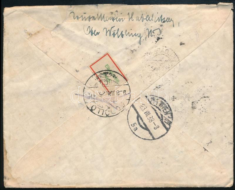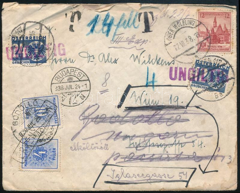 Description: 1938 Levél Ausztriából Deutsches Reich bélyeggel bérmentesítve, érvénytelenített osztrák és magyar portóval visszaküldve. 3 ország bélyegei 1 borítékon, ritka és érdekes darab!!
