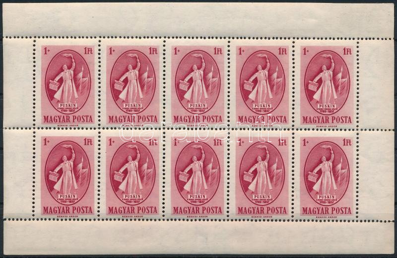 1949 Puskin tízes kisív végigfutó fogazással (80.000) (az egyik ívszél...