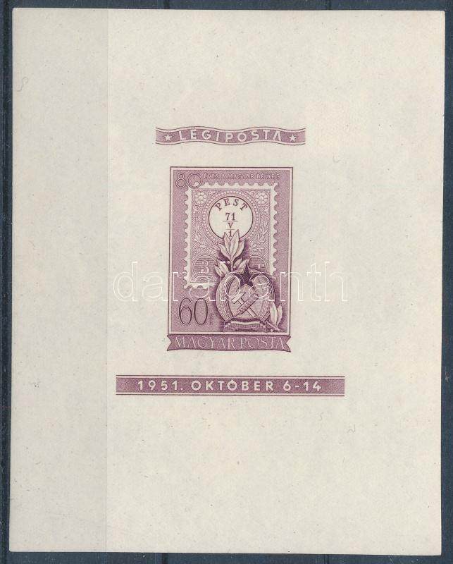 1951 80 éves a magyar bélyeg lila vágott blokk (450.000) (törés, halvá...