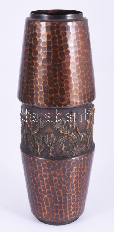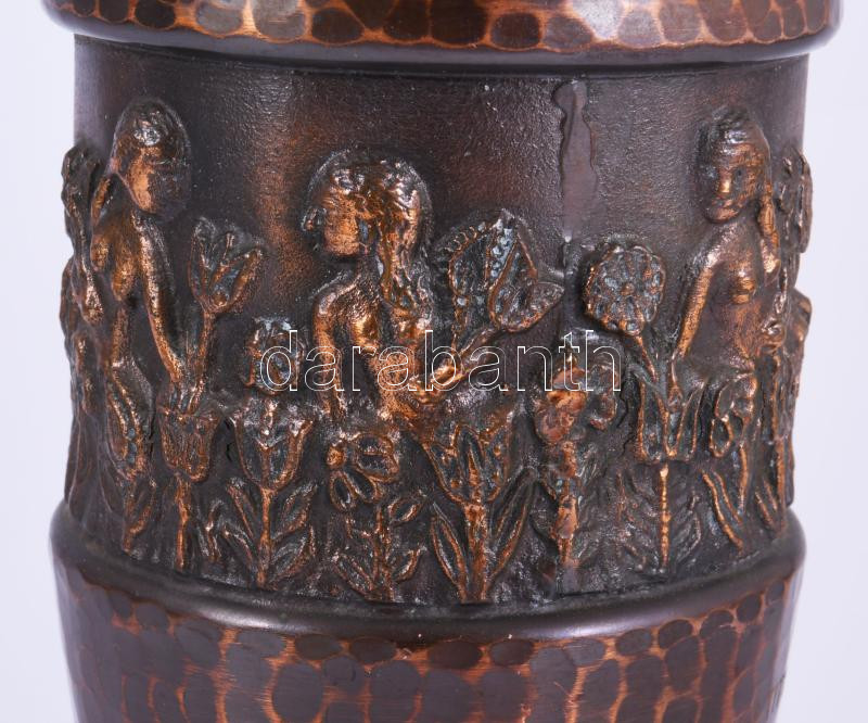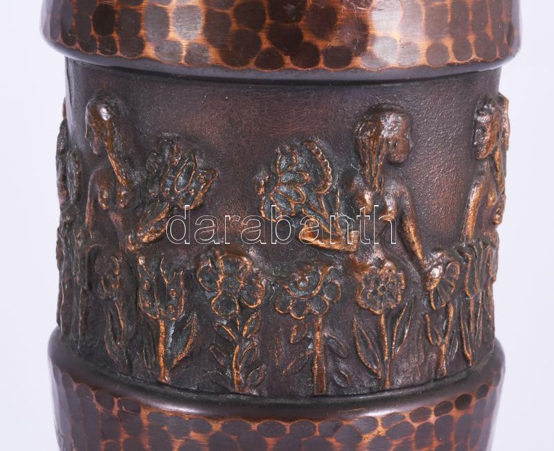 Iparművész réz váza, virágszedők jelenettel, m: 24 cm