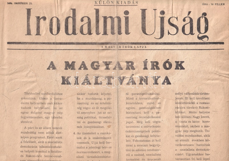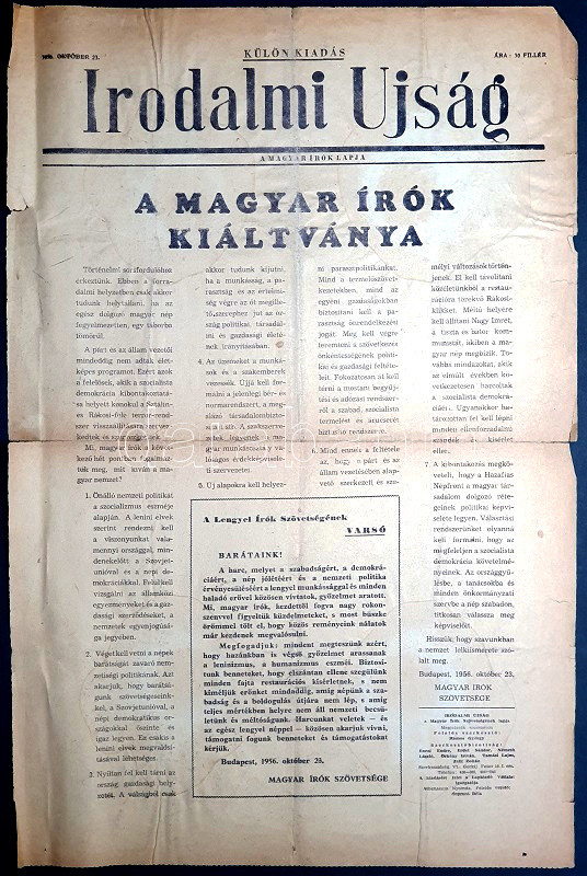 A forradalom kitörésének napján keletkezett írószövetségi röpirat a legégetőbb politikai kívánalmakat foglalja hat pontba. Kiáltványunk nemzeti egyenrangúságot, önálló külpolitikát, szakszervezeti érdekképviseletet, üzemi tanácsokat, önkéntességen alapuló szövetkezesítést, paraszti önrendelkezést, szabad választásokat, Rákosi Mátyás elmozdítását és Nagy Imre kinevezését követeli. Történelmi értékű író proklamáció, amely az elkövetkező napok politikáját is meghatározta. Röpiratunkon halvány foltosság, a hajtások mentén kisebb szakadásnyomok.