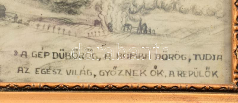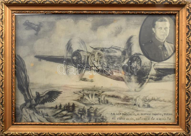 1942. Tóth Dezső bombázó repülőgépet ábrázoló grafikája, "A gép dübörög..." vers részlettel, üvegezett keretben