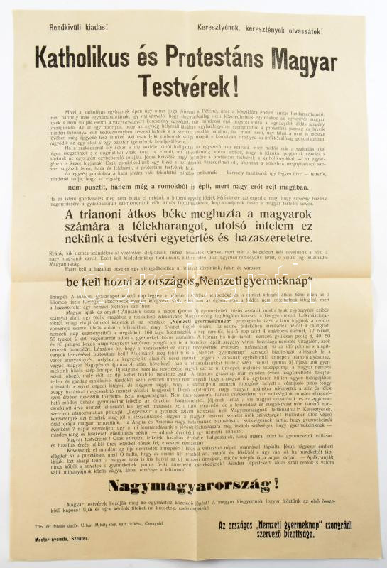 ca 1920 A trianoni béke kapcsán megszervezendő Nemzeti Gyermeknap ünnep propaganda plakátja a csongrádi szervező bizottság kiadásában. 31x50 cm