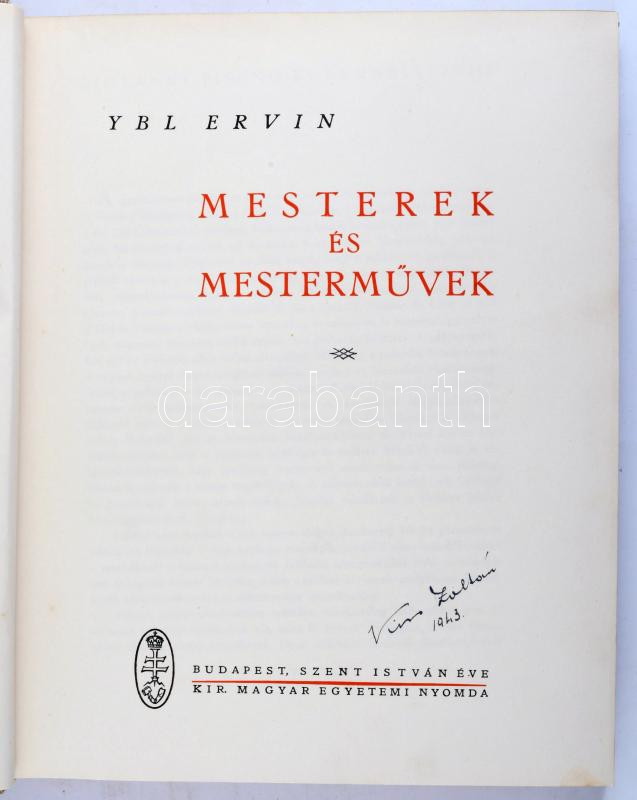 Description: Ybl Ervin: Mesterek és mesterművek. Bp.,1938, Kir. M. Egyetemi Nyomda. 259p + XLVIII. t. Fekete-fehér fotókkal illusztrált. Kiadói félvászon-kötésben jó állapotban