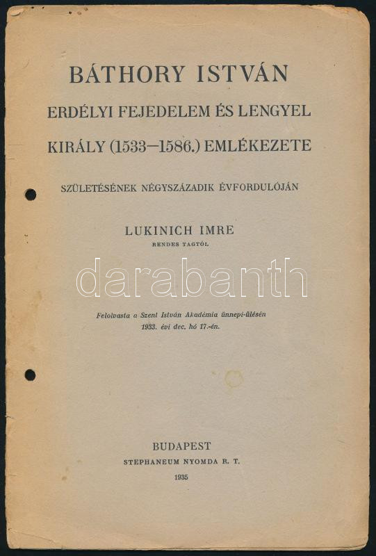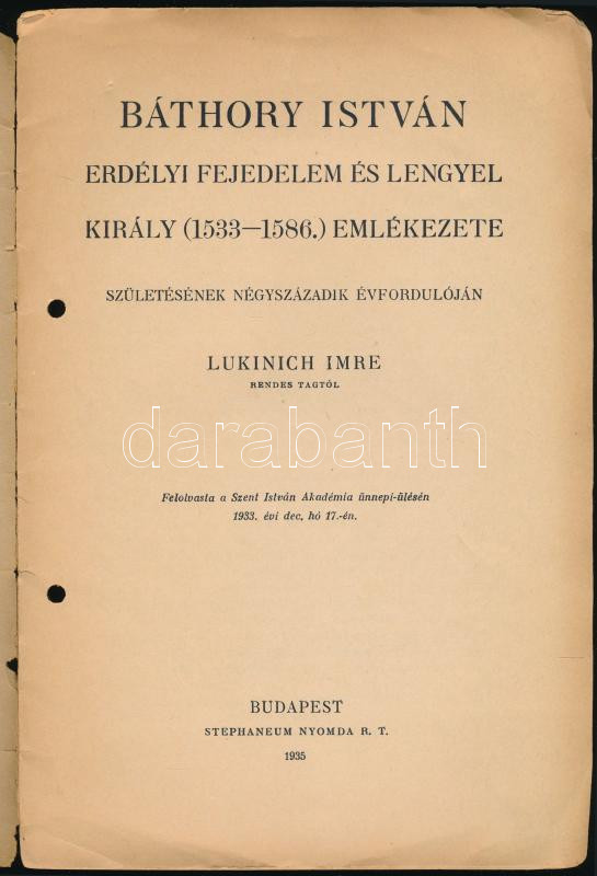 Description: Lukinich mre: Báthory István erdélyi fejedelem és lengyel király (1533-1586.) emlékezete. Születésének négyszázadik évfordulóján Bp., 1935. Stephaneum Ny. 23 p. Tűzve, kiadói papírborítóban. lyukasztva