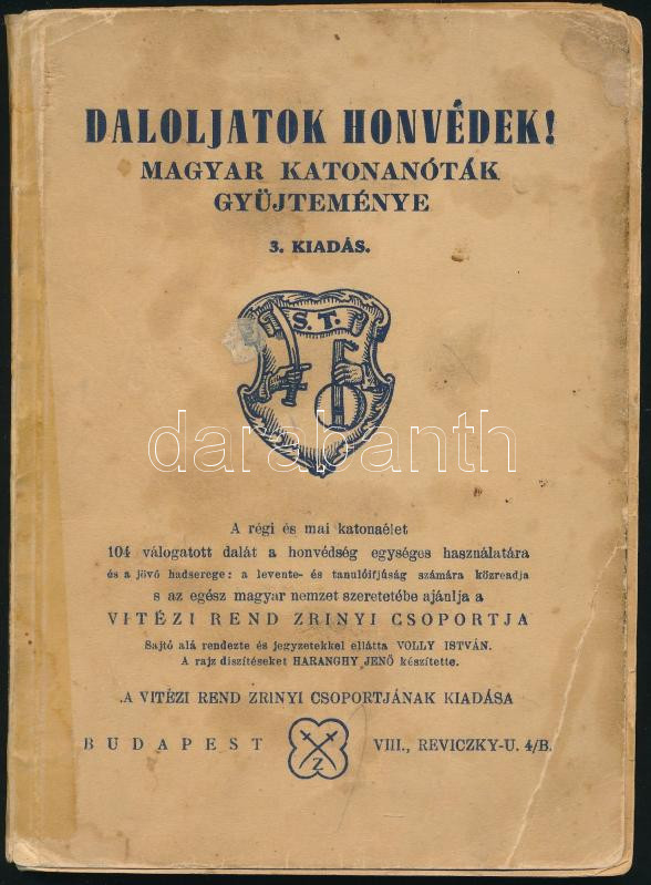 Description: Daloljatok honvédek! Magyar katonanóták gyüjteménye. 104 katonadal. Sajtó alá rendezte és jegyzetekkel ellátta Volly István. A rajzokat Haranghy Jenő készítette. Bp., 1940, Vitézi Rend Zrínyi Csoportja, 119 p. 3 kiadás. Kiadói papírkötés, kissé kopott, ragasztott borítóval
