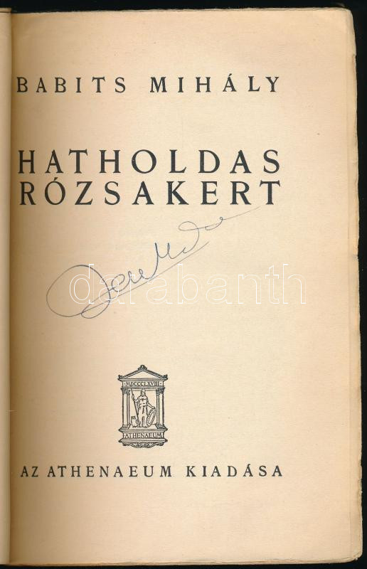 https://www.darabanth.com/en/513-Auction-philately-postcards-numismatics-artwork-books-collectibles-jewelry/513.0/Books/Books-Other-rarities~175/Babits-Mihaly-Hatholdas-rozsakert-Bp-1937-Athenaeum-157plus3-p-1-kiadas-Az-iro-fenykepevel~II3473295