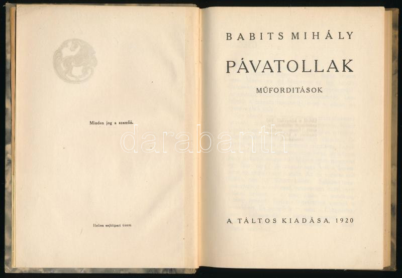 Babits Mihály: Pávatollak. Műfordítások. [Bp.], 1920., Táltos,(Helios-... https://www.darabanth.com/en/513-Auction-philately-postcards-numismatics-artwork-books-collectibles-jewelry/513.0/Books/Books-Other-rarities~175/Babits-Mihaly-Pavatollak-Muforditasok-Bp-1920-Taltos-Helios-ny-134plus2-p-Elso-kiad~II3473234