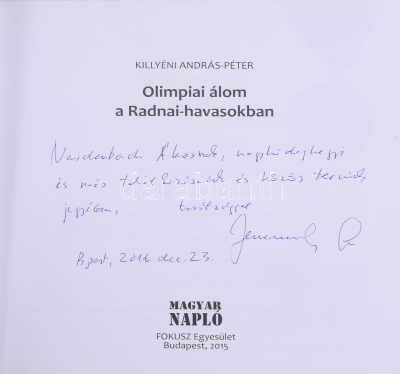 Killyéni András-Péter: Olimpiai álom a Radnai-havasokban. Bp., 2015, Magyar Napló. Kiadói kartonált papírkötésben. Dedikált Neidenbach Ákos hegymászó, turisztikai szakíró részére.