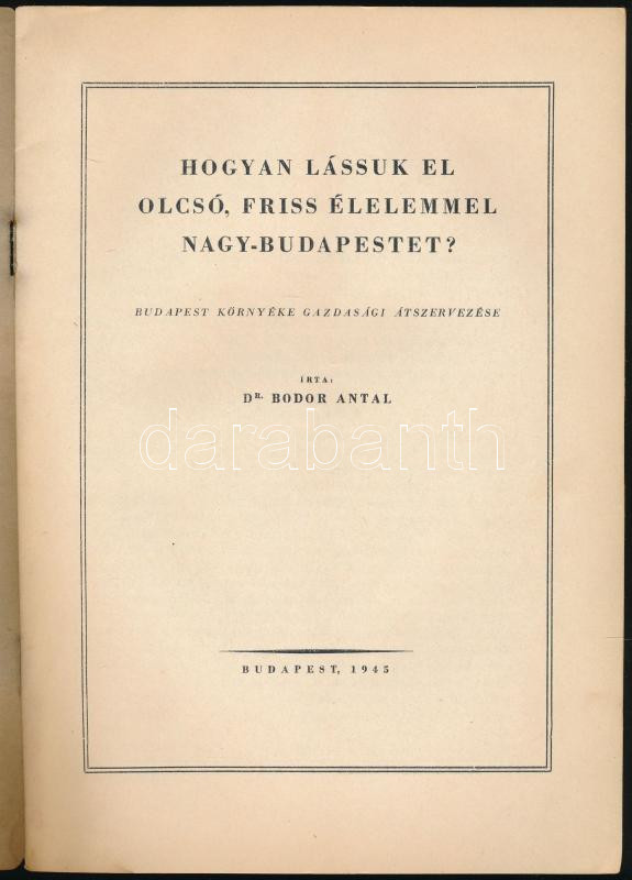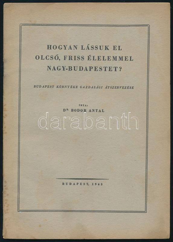 Bodor Antal: Hogyan lássuk el olcsó, friss élelemmel Nagy-Budapestet? Budapest környéke gazdasági átszervezése. Bp., 1945, szerzői kiadás (Székesfővárosi háziny.), 21 p. Kiadói tűzött papírkötés, foltos borítóval, a borító közepén törésnyommal.
