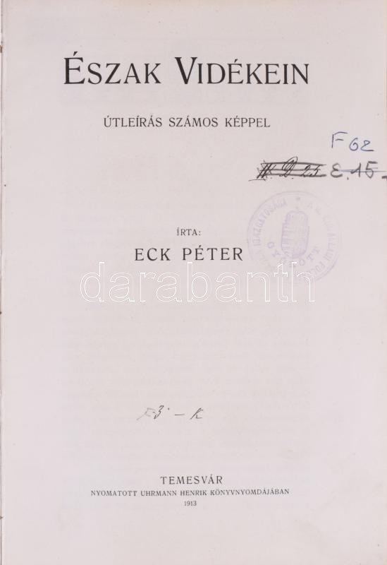 Eck Péter: Észak vidékein. Útleírás számos képpel. Temesvár, 1913, Uhrmann Henrik, 1 t.+134+1 p. Átkötött félvászon-kötés, márványozott lapélekkel, kopott borítóval, régi intézményi bélyegzésekkel.