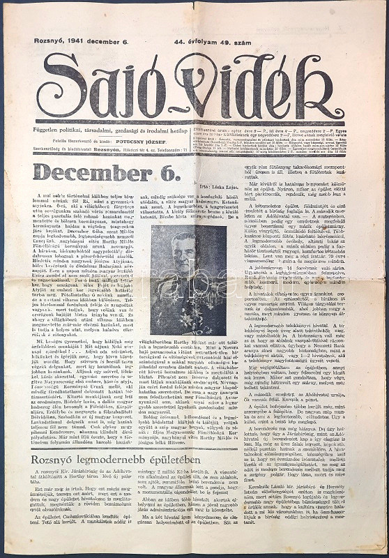 A keresztényszocialista szemléletű regionális hetilap, a rozsnyói Sajó-Vidék 1898-1944 között jelent meg. 1922-tÅ‘l a Rozsnyói Püspökség nyomdájába társult Potocsny József szerkesztette. A vegyes tartalmú: irodalmi cikkeket, politikai és helyi társadalmi hÃreket közlÅ‘ lap 4-8 oldal terjedelemben látott napvilágot. 1941. december 6-i lapszámunk az országgyarapÃtó Horthy Miklóst köszönti névnapja alkalmából. Lapunk beszámol a rozsnyói Actio Catholica elsÅ‘ kultúrestjérÅ‘l, egymondatos filmkritikákban minÅ‘sÃti a bemutatott filmújdonságok erkölcsi tartalmát, a züllött erkölcsű filmeket megróva, a helyes erkölcsiségű filmeket méltatva. Az utolsó oldalon helyi érdekeltségű gazdasági, kulturális és bűnügyi krónika. Oldalszámozáson belül képes hirdetésekkel.