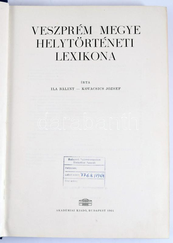 Ila Bálint, Kovacsics József: Veszprém megye helytörténeti lexikona. Bp., 1964, Akadémiai Kiadó. (Magyarország helytörténeti lexikona) Kiadói egészvászon-kötésben, volt könyvtári könyv