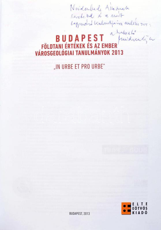 Mindszenthy Andrea (szerk.): Budapest: Földtani értékek és az ember. Bp., 2013, ELTE Eötvös kiadó. Szerkesztő (Mindszenthy Andrea) által dedikált Neidenbach Ákos hegymászó, turisztikai szakíró részére.