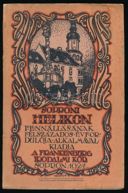Soproni Helikon. Fennállásának félszázados évfordulója alkalmával kiadja: a Frankenburg Irodalmi Kör 1877-1927. Sopron, 1927, Vitéz Tóth Alajos-ny., 172 p.+ 1 t. A borító Ágoston Ernő munkája. Kiadói papírkötés, viseltes, foltos borítóval, sérült, hiányos gerinccel, helyenként kissé foltos lapokkal, kijáró képtáblával.