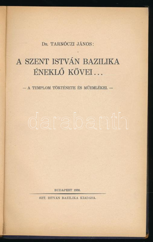 Tarnóczi János: A Szent István bazilika éneklő kövei... A templom története és műemlékei. Bp., 1938, Szent István Bazilika, 124+(4) p. Egészvászon-kötésben, kissé viseltes borítóval.
