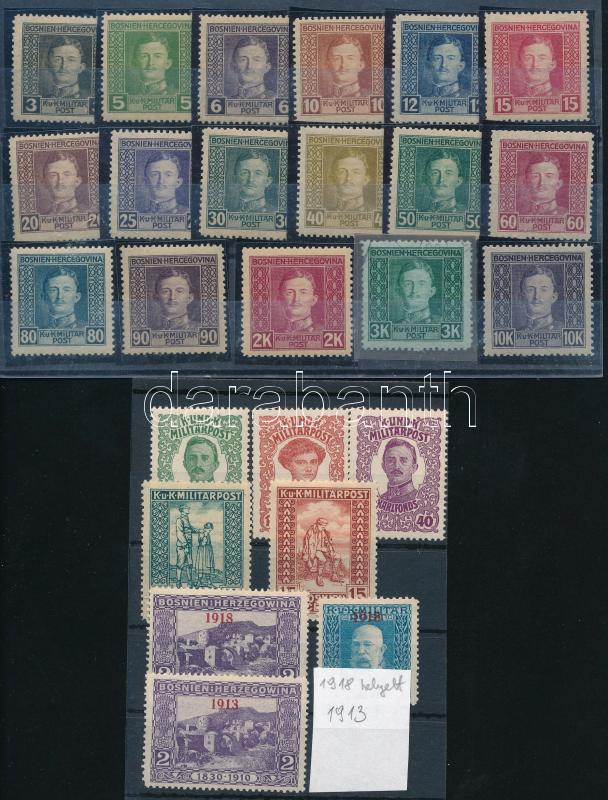 Description: 1917 Károly sor (3K pecsételt / used) + 1918 Jótékonyság a rokkantak javára + Jótékonyság Károly alapítványa javára sor + Kisegítő bélyegek sor + lila 2H az évszám 1918 helyett 1913-nak látszik