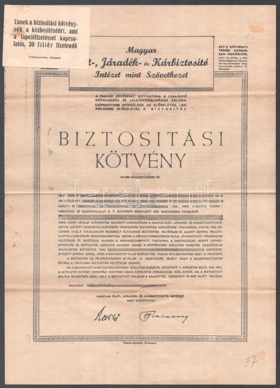 1948 Biztosítási kötvény 30f kézbesítési portó szelvénnyel