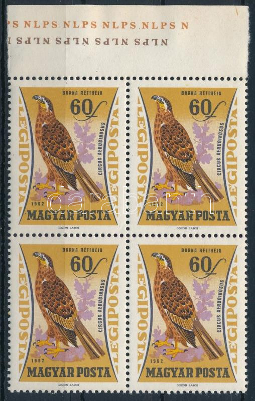 1962 Madarak 60f ívszéli négyestömb, az ívszélen felirattal