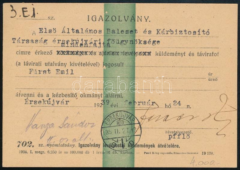 1939 Meghatalmazási igazolvány levélpostai küldemények átvételére. Rendkívül ritka postai nyomtatvány, "ÉRSEKÚJVÁR" luxus minőség