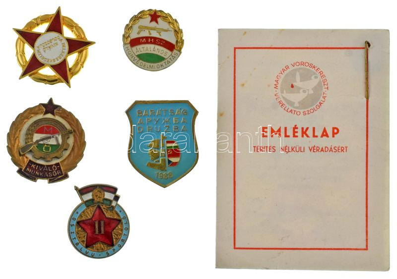 Vegyes 6 db szocialista zománcozott bronz jelvény, közte: "Barátság 1988" + "MHSZ Általános Honvédelmi Oktatás" + "II. Osztályú Sportoló" + "Kiváló Munkásőr" + "A Belkereskedelem Kiváló Dolgozója" + "Véradásért" zománcozott bronz jelvény emléklappal