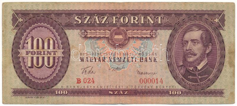 1957. 100Ft "B 024 000014" alacsony sorszám T:F