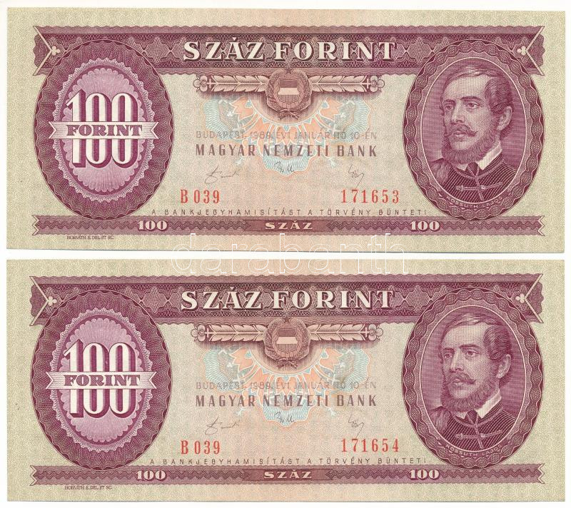 1989. 100Ft (2x) sorszámkövetők "B 039 171653 - B 039 171654"...