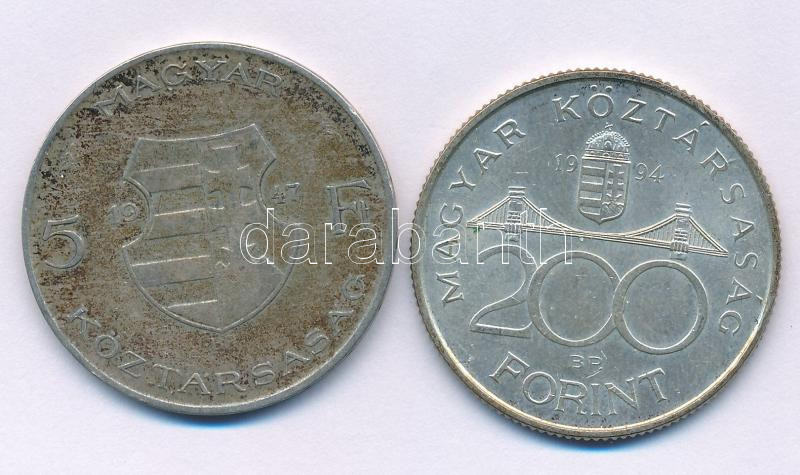 1947. 5Ft Ag "Kossuth" + 1994. 200Ft Ag "Deák" T:F...