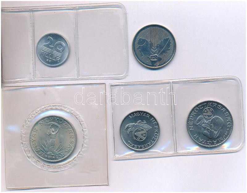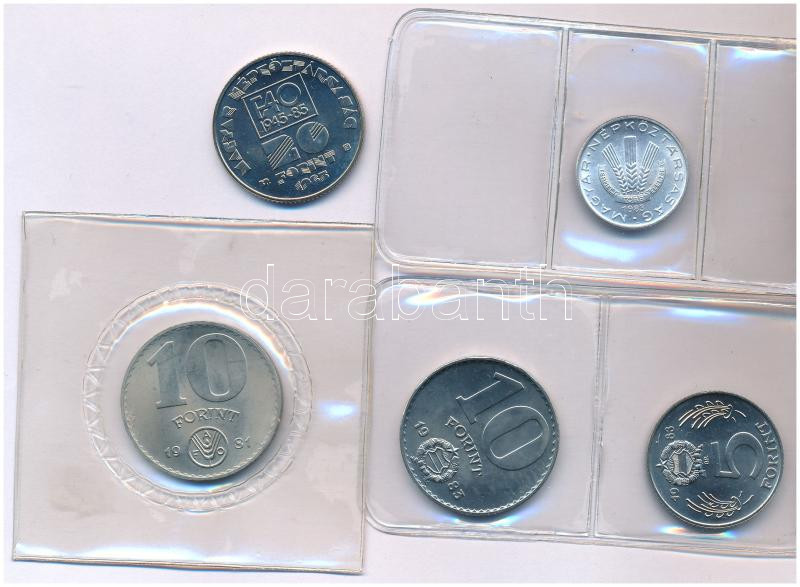 Description: 1981. 10Ft Ni "FAO" lezárt fóliatokban + 1983. 20f Al + 5Ft Ni + 10Ft Ni "FAO" sor, eredeti műbőr tokban, tanúsítvánnyal (a tok belső lapja kiszakadt) + 1985. 20Ft Cu-Ni "FAO" kapszulában T:UNC