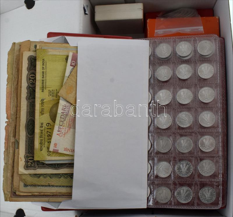 "Grandpa's treasure chest", within Hungarian Al coin set in two holders, ~1992-2007. 1 Forint and 2 Forint coins, 1994. 200 Forint Ag (6x), more than 40pcs Hungarian and foreign banknotes, used capsules, Hungarian and foreign badges, ~1970. "For armed service to the socialist homeland" military souvenir box with bronze plaque (2x, 125x97mm). C:mixed