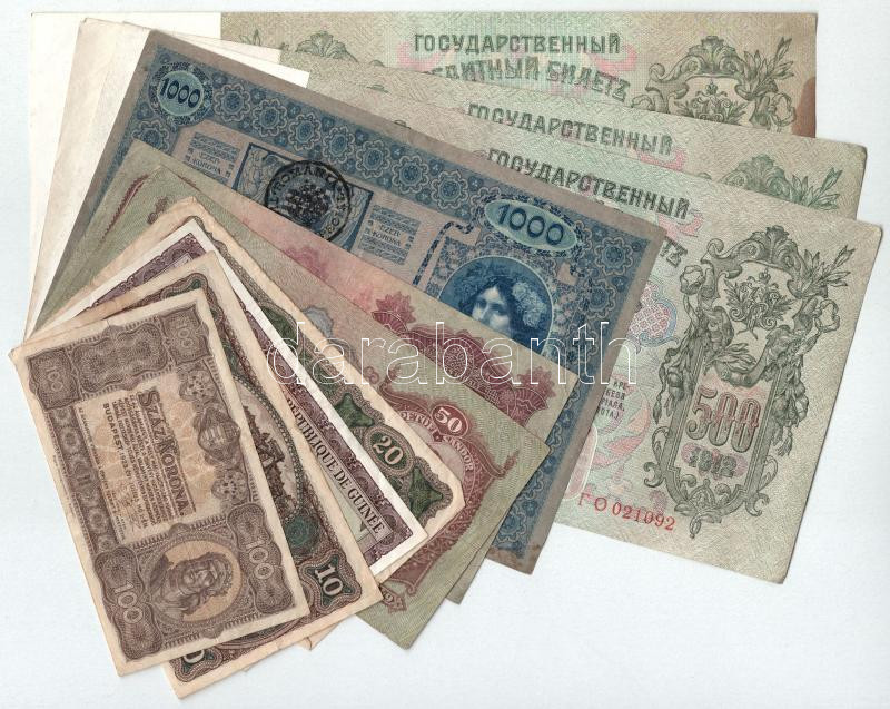 Vegyes 10db-os papírpénz tétel, közte: 1902-1932. 20-1000K (3x) + 50-100P (2x) + Orosz Birodalom 1917-1921(1912) 500R Szign.: Shipov (3x) + Guinea 1960. 100Fr T:F-VG