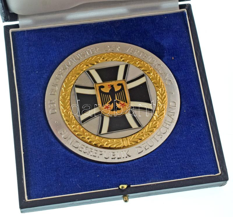 Németország DN "A NÉMETORSZÁGI SZÖVETSÉGI KÖZTÁRSASÁG VÉDELMI MINISZTERE" "DER BUNDESMINISTER DER VERTEIDIGUNG BUNDESREPUBLIK DEUTSCHLAND" zománcozott, aranyozott bronz emlékérem, hátoldalon "Parlamentarischer Staatssekretär" gravírozással és "HOFFSTäTTE BONN" gyártói jelzéssel, dísztokban (79mm) T:AU