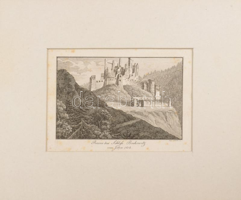 Description: Régi várak, kastélyok, fotón és metszeten: Grundlsee, Kirchdorf 36 db kabinetfotó + cca 1860 Leopold Müller(1834-1882): Ruine des Schloss Boskovitz vom Jahre 1814, metszet, 12x15 cm
