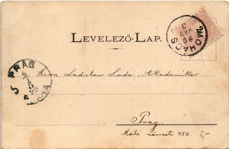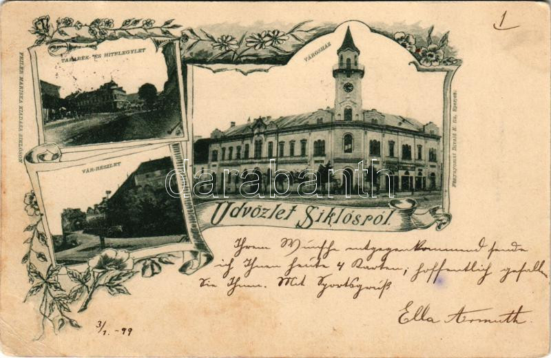 Description: 1899 Siklós, Takarékpénztár és hitelegylet, Városháza, üzletek, vár részlet. Feiler Mariska kiadása. Fénynyomat Divald K. fia. Art Nouveau, floral (EB)