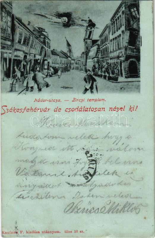 Description: 1899 Székesfehérvár - De csodálatosan nézel ki! Nádor utca este holdfényben, a Biela üstökös emlékére készített montázs, részeg humor. Kaufman F. kiadása (kicsit ázott sarok / slightly wet corner)