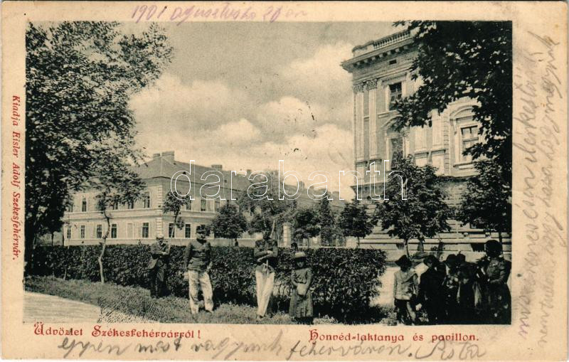 1901 Székesfehérvár, Honvéd laktanya és pavilon, K.u.K. katonák. Eisler Adolf kiadása (fl)
