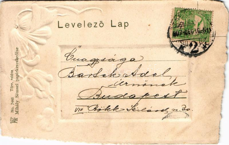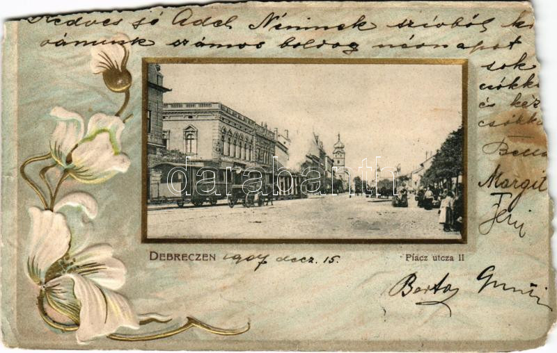 1907 Debrecen, Piac utca, városi vasút, vonat. Mihály Sámuel kiadása. Art Nouveau, Emb. floral litho (b)