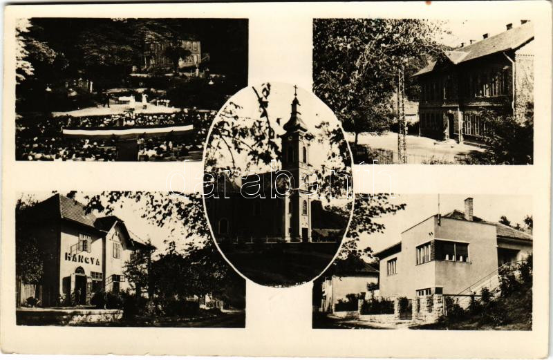 1944 Pereces, Diósgyőr-Perecesbánya (Miskolc); szabadtéri játékok, állami népiskola, római katolikus templom, Hangya szövetkezet, utcarészlet