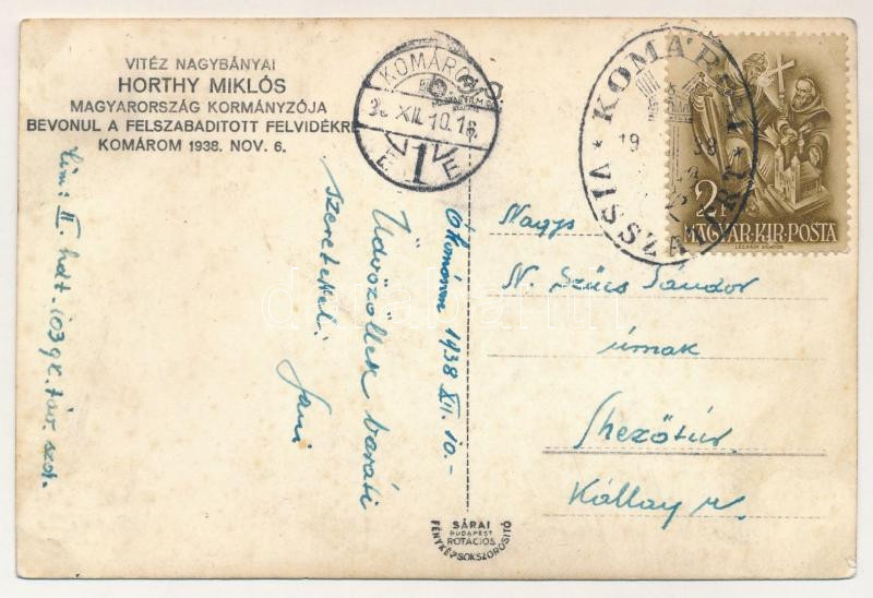 1938 Komárom, Komárno; bevonulás, Horthy Miklós, Purgly Magdolna, Imrédy Béla, Teleki Pál / entry of the Hungarian troops + "1938 Komárom visszatért" So. Stpl. (fl)