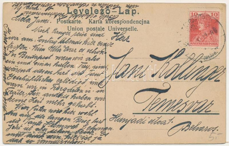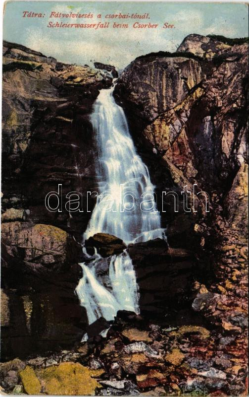 Description: Tátra, Magas-Tátra, Vysoké Tatry; Fátyolvízesés a Csorba-tónál. Cattarino S. utóda Földes Samu kiadása 1917. 210. sz. / Schleuer Wasserfall beim Csorba-See / Strbské pleso / waterfall near the lake (EK)