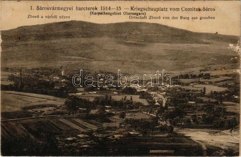 Description: Zboró, Zborov; Zboró a várból nézve. Sárosvármegyei harcterek 1914-15. 1. D.K.F.E. 1916. / Kriegsschauplatz vom Comitat Sáros. Ortschaft Zboró von der Burg aus gesehen / WWI K.u.K. military, general view from the castle ruins (EB)