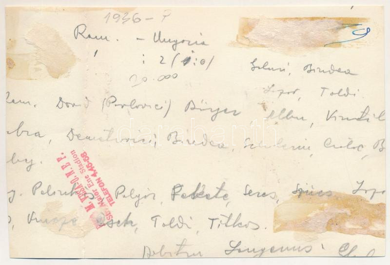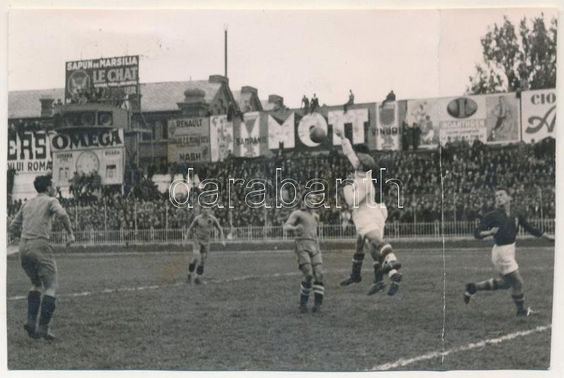 1936 Bucharest, Bukarest, Bucuresti, Bucuresci; Románia - Magyarország 1:2 labdarúgó mérkőzés, focisták a pályán, Omega, Mott, Renault reklám / Romania - Hungary football match, players, advertisements, sport. photo (14,6 x 9,6 cm) (non PC) (fa)