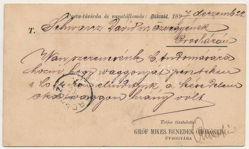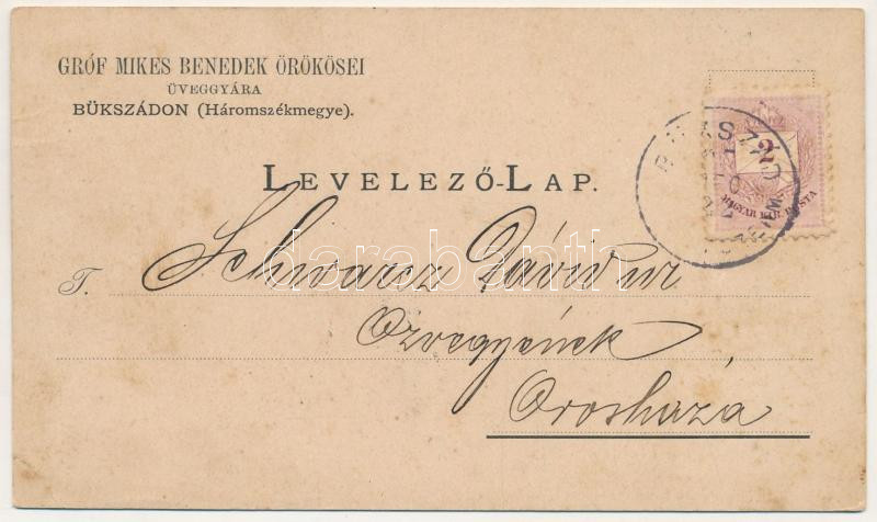 1897 Sepsibükszád, Bükszád, Bixad (Háromszék megye); Gróf Mikes Benedek örökösei üveggyára reklám / glass factory's advertising postcard (EB)