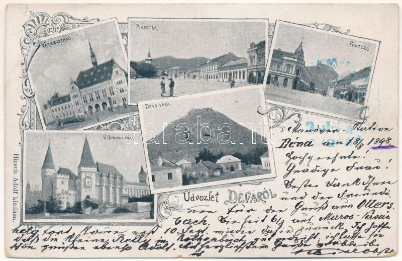 1898 Déva, Vármegyeháza, Piac tér, Fő utca, Déva vára, Vajdahunyad vára, Holtzer Károly üzlete. Hirsch Adolf kiadása, szecessziós-virágos keret / county hall, market square, main street, castle ruins in Deva, castle in Hunedoara. Art Nouveau, floral frame (Rb)