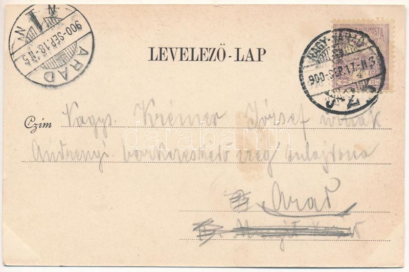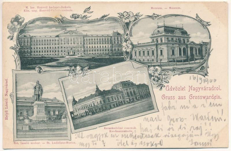 1900 Nagyvárad, Oradea; M. kir. honvéd hadapródiskola, Múzeum, Szent László szobor, Kereskedelmi csarnok. Helyfi László kiadása, szecessziós-virágos keret / Kön. ung. Honvéd-Cadettenschule, Museum, St. Ladislaus-Statue, Kaufmannshalle / K.u.K. military cadet school, museum, monument, trade hall. Art Nouveau, floral frame (fl)