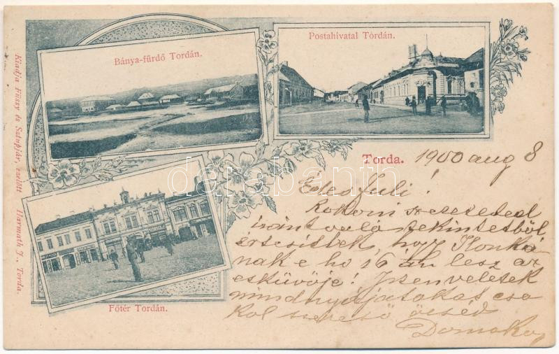 1900 Torda, Turda; Bánya-fürdő, Postahivatal, Fő tér, Harmath üzlete. Füssy és Sztupjár kiadása (ezelőtt Harmath J.) / spa, post office, main square, shops. Art Nouveau, floral (EB)